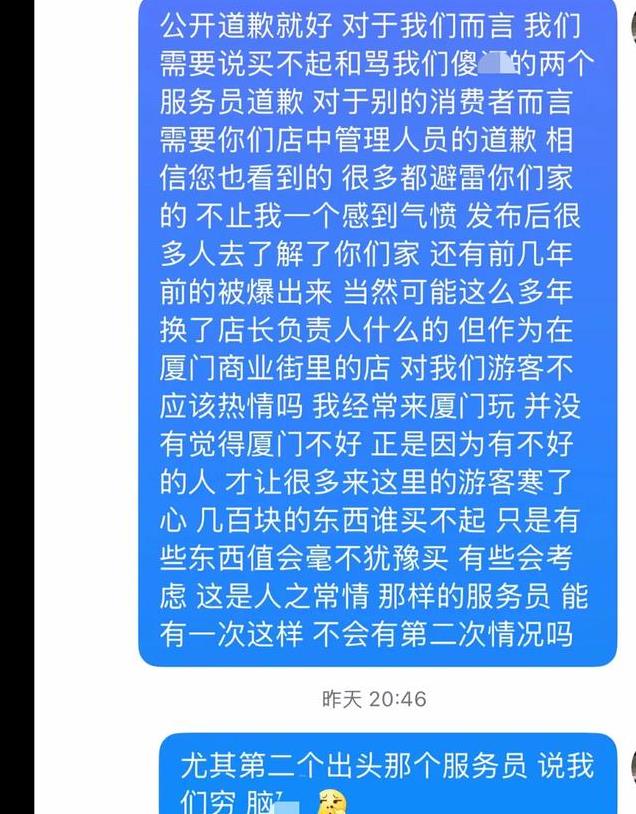店家负责人说看完监控确实店员做的不对,并且道歉还问网友有什么要求,这两名网友是游客,要求那两名骂人的店员道歉,大概有点寒心,本来就是来旅游的,没想到遇上这样的事情。