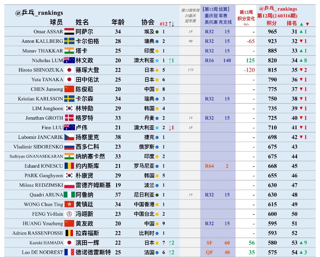 篠塚大登清除掉了120个积分,排名下滑两位来到了35名。滨田一辉上升了九个名次,来到了第53名。他在WTT奥托塞克支线赛事打进了四强,增加了56个积分。瑞典老将卡尔森在支线赛事夺冠,排名上升了22位,目前世界排名第88名。国乒选手林高远排名下滑了七位,减掉70个积分之后排名第70位。