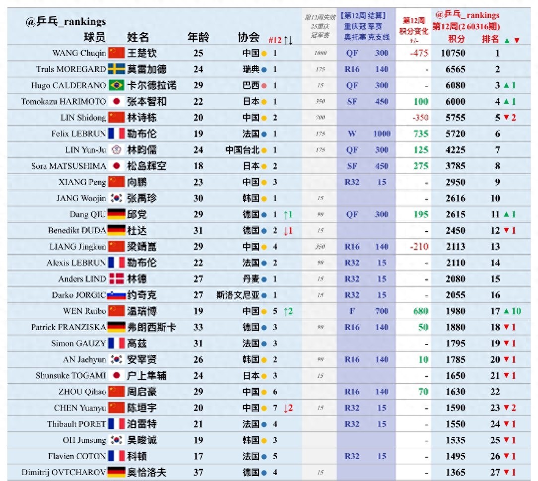 这次巴西选手雨果和张本智和排名各上升一位,虽然这两人都没有打进半决赛,但是由于另一个选手林诗栋没有参赛积分到期,减掉了350个积分之后,排名下滑了两位,来到了世界第五。这样雨果排名世界第三,张本智和排名世界第四。林诗栋参加完新加坡大满贯赛事之后,就退出了这次重庆冠军赛。