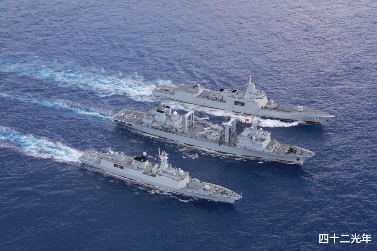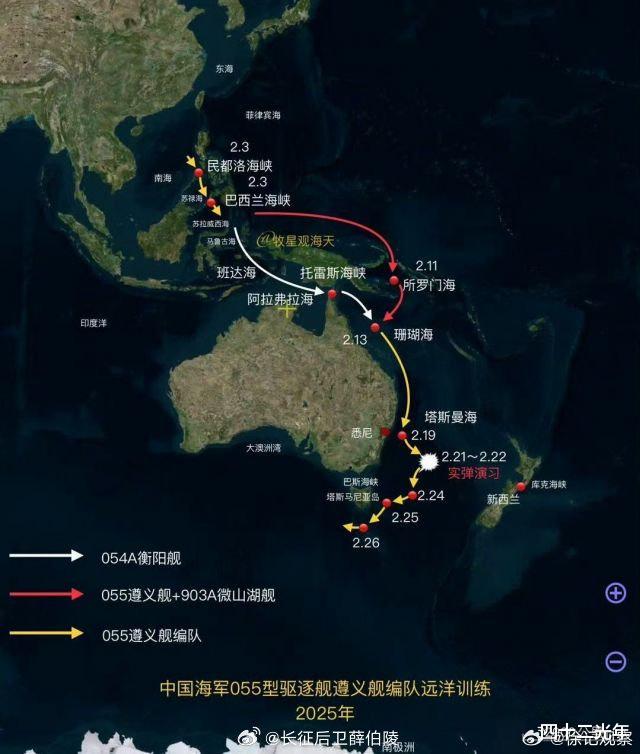 实弹演习之后,055驱逐舰编队并没有返航,而是一路南下,看样子准备绕行土澳一圈。