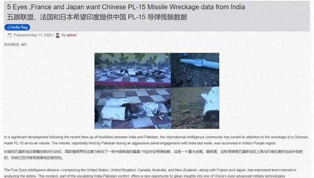 好不容易双方同意停火了,现在印度方面又开始了新的“赢学”叙事。来自《印度国防研究所》的消息称,印度获得了霹雳-15E的残骸,多个国家都对此表示了兴趣,包括美国、法国、日本等等,而印度已经和日本达成一致,印方将转交部分残骸,供日本军事部门研究。