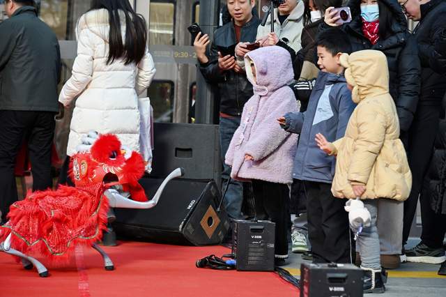 传统文化与现代科技的碰撞成为活动亮点:国家级非遗横山腰鼓、华阴老腔轮番上演,尽显陕北文化底蕴;“赛博格秧歌”AI机器人与国内首个“AI豆腐人”同台献艺,为传统年味注入科技活力。街区内,古装NPC巡游派福、“驼城豆腐香 • 年货团圆味”主题文创展示,让非遗潮玩成为年轻群体追捧的新风尚。