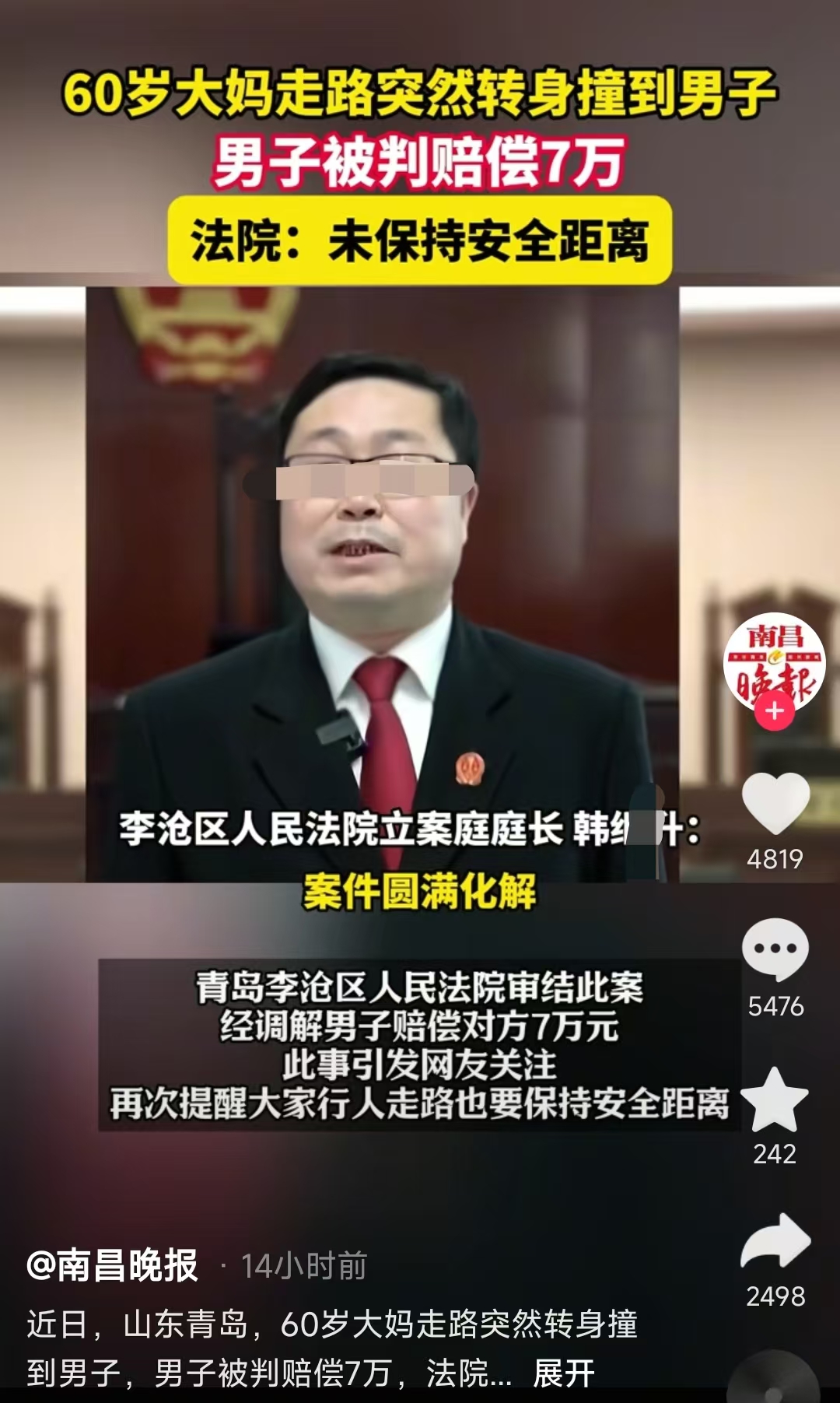如今青岛老太转身撞人案,俨然开创了另一个先河。
