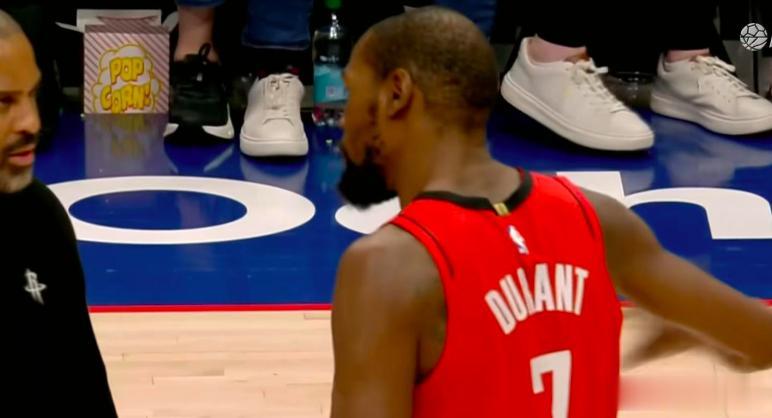 当时时间所剩无几,火箭落后1分。球发出来,杜兰特在三分线外一个大空位,手都伸半天了。可持球的申京呢?他背身扛着两个人,硬是来了个小勾手。球咣当一声没进,比赛结束。杜兰特后场看得清清楚楚,气得在场上一通肢体语言表演。那个意思很明显:“大哥,我这儿空着呢,你倒是传啊!”