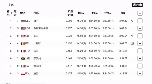 然而,在最后一棒,荷兰队的女选手博尔以惊人的表现超越了美国队,帮助荷兰队以3分07秒43的成绩夺冠,而美国队则以3分07秒74的成绩屈居亚军。
