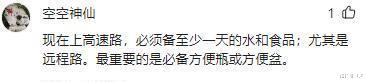 网友称,老司机上高速会备足一天的水和食品,尤其是长途出行,必带便于使用的瓶子或盆子以备不时之需。