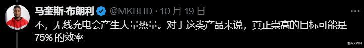 结果一个油管上的顶流数码 up 主 Marques Brownlee( 油管频道 MKBHD ,在海外数码圈的地位约等于国内的影视飓风 ),在视频底下直接强势输出,表示无线充电会浪费非常多的热能,效率顶多只有 75% 。