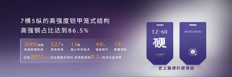 EZ-60 延续了马自达在安全领域的核心DNA。发布会上,长安马自达汽车有限公司执行副总裁邓智涛向参展嘉宾展示了“史上最硬的车展邀请函”——它以2,000MPa的热成型钢制成,取自EZ-60的车身,历经527个昼夜研发,包含13项核心专利技术,在达到 2,073MPa抗拉强度的同时,依然能保持8.2%的均匀延伸率,强度提升40%,重量减轻19%,这块特殊的邀请函象征着长安马自达在安全领域追求极致的坚定信念。