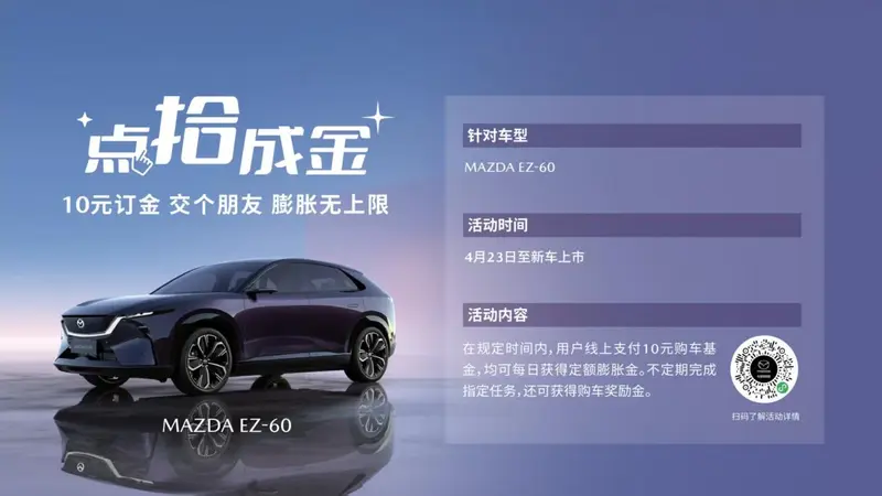 作为行业首个亮相即开启预订的车型,EZ-60推出了“点拾成金”的预订政策:订金10元,每天膨胀,膨胀不封顶,直至新车交付,膨胀金直接抵扣车款。即日起,国内消费者可通过长安马自达官网、「悦马星空」官方APP/小程序,以及授权经销商预订新车,尊享智电豪华出行新时代。