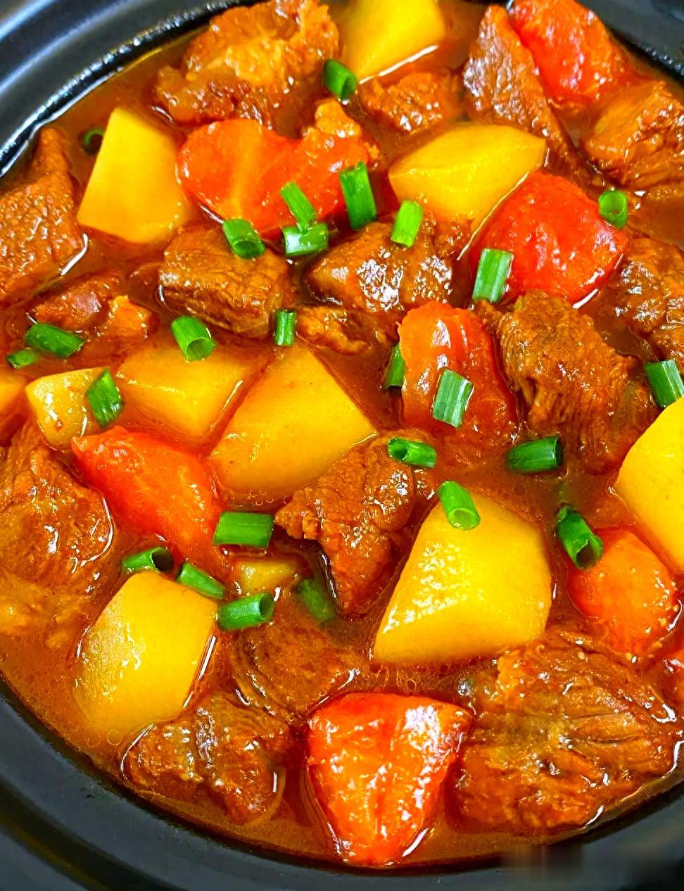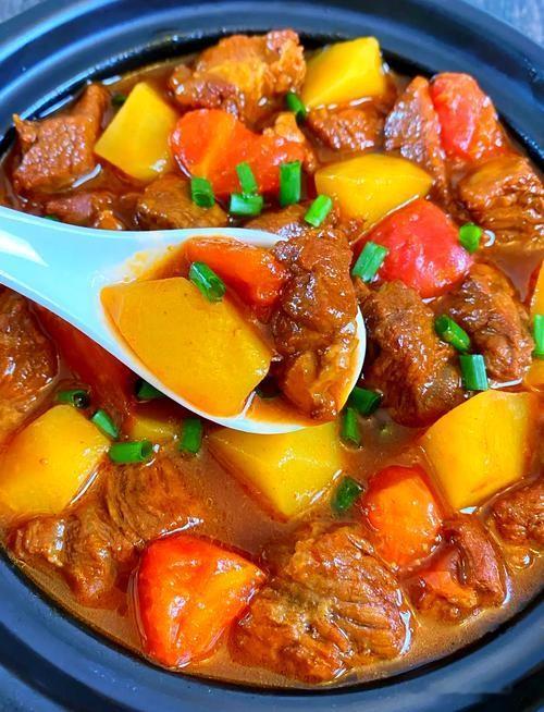土豆防碎: 浸泡:切好后泡水去除表面淀粉,不易糊锅。 时机:一定要在牛肉基本炖软后再下,否则土豆会炖碎。 煎炸(可选):土豆沥干后,可用少量油煎至表面微黄再下锅,更香且不易碎。汤汁浓稠秘诀:在最后收汁阶段,可以用勺子将一部分已经炖软的土豆压成泥,混合在汤汁中,能自然让汤汁浓稠包裹食材。风味升级: 番茄味:在炒牛肉步骤后,加入1-2个去皮切块的番茄炒至软烂,再加水炖煮,形成酸甜汤底。 咖喱味:在加入土豆时,同时加入1-2块咖喱块,即成简易版咖喱牛肉。隔夜更美味:这道菜和红烧牛肉一样,隔夜回热后风味更融合,土豆也更入味。四、与红烧牛肉的对比与选择