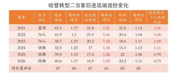 此外我们注意到哈登在控卫位置上的整体戏份高达87分评分的同时,每回合创造得分效率也能够拿到80分,是一个高产高效的扛球权型球员,这充分说明他在进攻端依然是联盟一线实力。