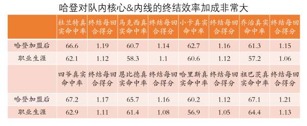 哈登对于队内中锋效率的提升同样明显,篮网的克拉克斯顿、76人的恩比德和哈利斯、快船的祖巴茨都在哈登加盟球队后有了终结效率的明显提升。而骑士队有两个非常出色的内线莫布利和阿伦,哈登的加入对他们的帮助会非常巨大。