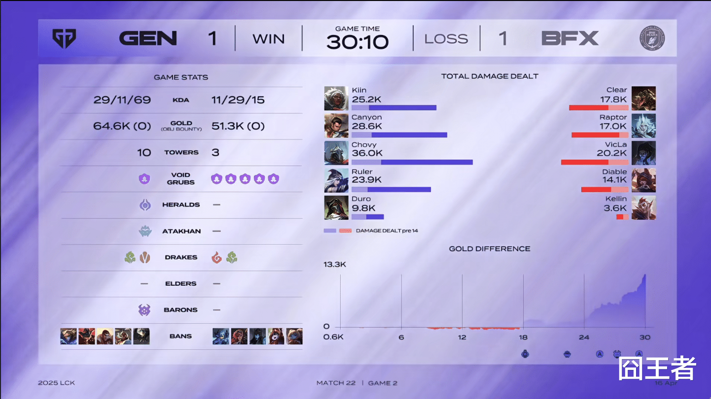 结果第二局比赛,前中期两队争夺的比较厉害,不过进入中期后,就是GEN的天下了。比赛第17分钟左右,两队爆发先锋团。Ruler艾希双杀GEN残局打出0换4大胜,此后GEN占据主动;比赛第24分钟左右,Chovy维克托双杀帮助GEN一波打出2换4;最终30分10秒,GEN团灭BFX,扳回一局。