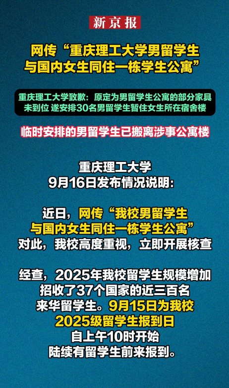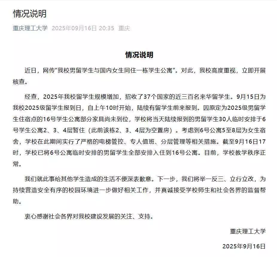 四、致歉不是终点:高校该如何守住学生的 “安全感”如今,30 名男留学生已经搬离 6 号宿舍楼,重庆理工大学的致歉声明也发了,但女生们心里的疙瘩,不是一句 “对不起” 就能解开的。对高校来说,学生的安全感和信任感,比 “国际化办学” 的名头更重要 —— 不管是本土学生还是留学生,都希望在学校里能住得安心、学得放心。