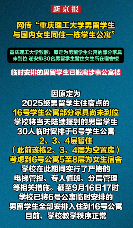 二、学校回应:连夜打扫的空置楼层,为何还是惹了众怒?随着网上的争议越来越大,9 月 16 日晚上 7 点,重庆理工大学终于在官方微博上给出了说法。原来,今年学校扩招留学生,一共招了近 300 人,比去年多了快 100 人。一开始计划让男留学生住 16 号公寓,可开学前一周才发现,公寓里的床架和衣柜还没送到,根本没法住人。