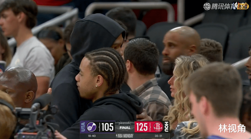 比赛结束,两队球员很友好,在场上互相拥抱致意,本场比赛没有上场的乔治,从替补席起身,走到火箭替补席这里,和阿杜拥抱致意,两人还简单笑谈两句,看起来关系很好。