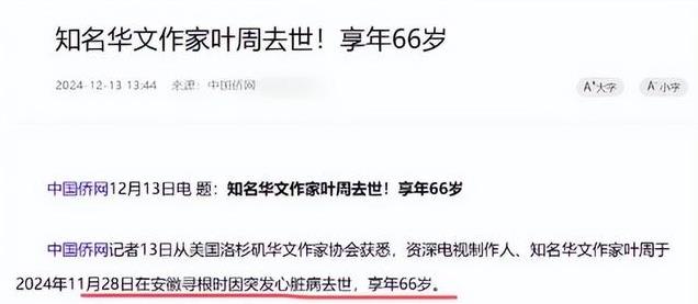 文坛巨匠一个接一个地“落幕”,让人直呼“文学界真要塌房了”。继琼瑶、叶嘉莹之后,又一位才华横溢的华文作家叶周于安徽寻根时离世,年仅66岁。