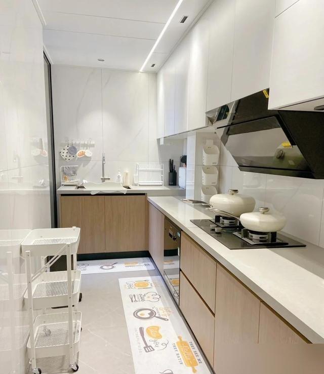 地砖通铺更狠,厨房餐厅客厅一条线跑完,"视觉高铁"嗖地把80㎡吹成100㎡。