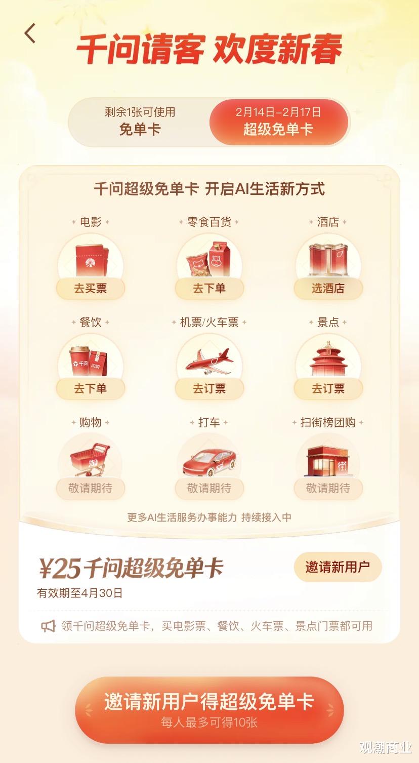 2月14日,千问突然宣布免单再加3天,接入大麦、飞猪,邀请全国人民体验AI买电影票、门票等新功能,激活春节AI新消费。从今天下午3点到大年初一,每个人可再领10张25元超级免单卡。