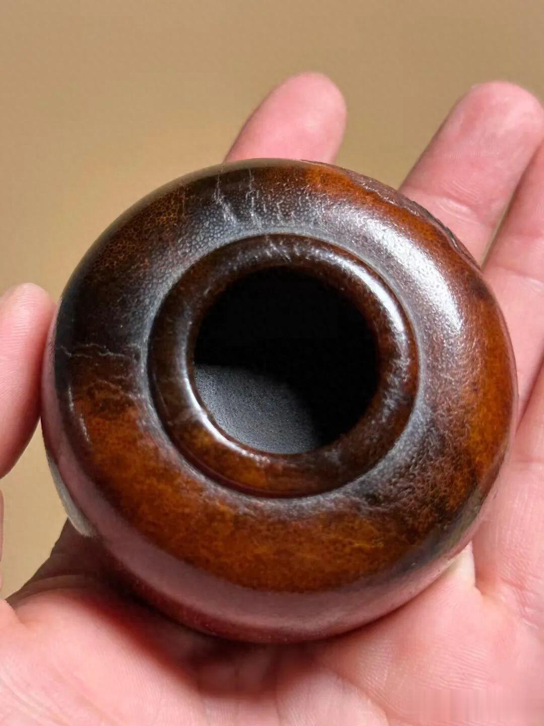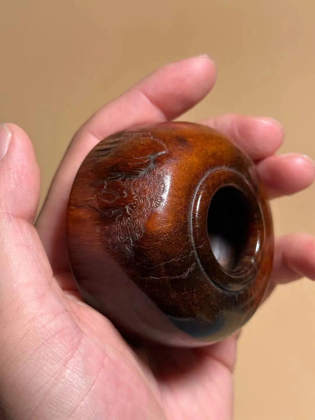整个角雕不大,放在手心有点小巧玲珑,器形圆润。看起来是个装东西的小容器。笔者查阅了相关资料,发现这小角雕件其实是号称文房第五宝的水盂。就是给砚池添水用的小容器。在秦汉时期就已经出现了,但是材质基本上是陶瓷和玉石之类的东西。像这种犀角雕去做的,还是非常罕见的。