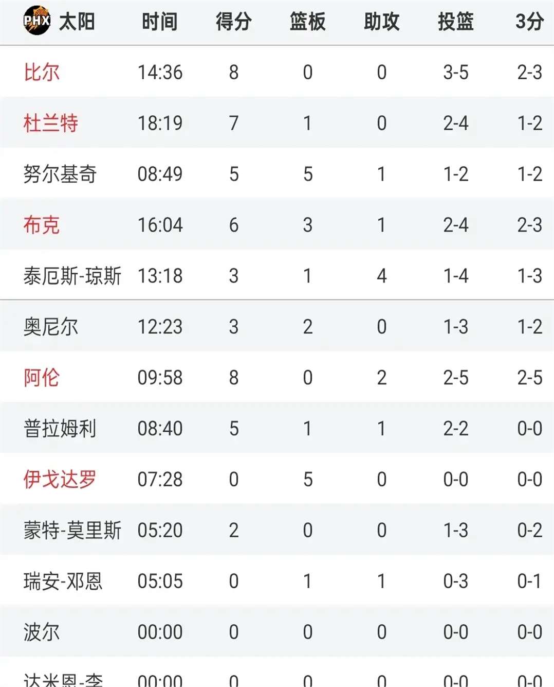 太阳队方面,杜兰特半场比赛得到7+1的数据,全场砍下25+7的数据。布克虽然在上半场表现一般,但全场依然得到15分4篮板6助攻1抢断1盖帽的数据。比尔在上半场得到8分,下半场发挥出色,全场得到24分3篮板1助攻1抢断1盖帽。