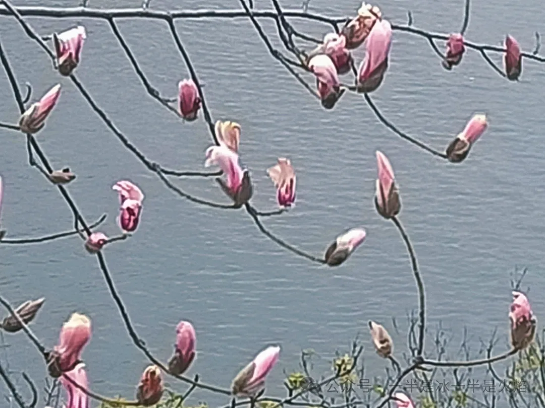 玉兰花更妙,不叶而花,满树齐放,花瓣色白,底部却是紫红色,素淡中擎一抹轻俏的艳丽可爱。