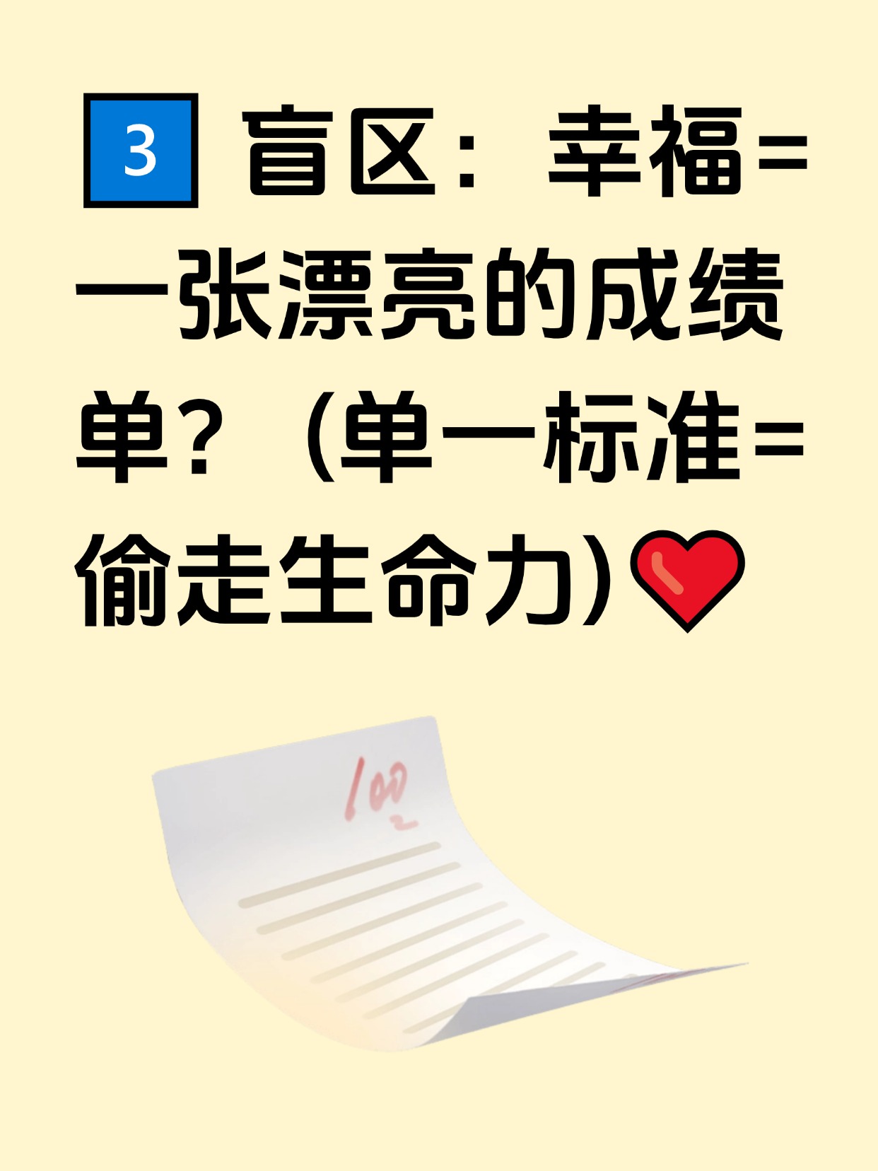3️⃣ 盲区:幸福=一张漂亮成绩单? (单一标准=偷走生命力) ❤️ “你看XX家孩子又考第一了...” 这话听着平常,却在悄悄给孩子洗脑:只有第一名/高分才有价值。 但真相是: 人生浩瀚无垠,不是一条独木桥!把价值锁定在外界评价(尤其成绩)上,孩子心理压力巨大。 后果太痛: 中科院数据,24.6% 青少年检出抑郁!很多就源于这种单一评价体系。孩子会觉得:“考砸了,我就没价值了...” 醒一醒: 一次失败的尝试、一首写坏的小诗,都可能是珍贵成长的起点!生命的可能性,远不止成绩好这一条路。 觉醒就是力量:孩子的困境,有时是我们认知的“盲区”。当我们自己醒了: 懂得爱与界限的平衡,孩子才有安全空间长出自主的翅膀。 放下时刻干预的执念,孩子才能在错误中练出真正的韧性。 打破“唯成绩论”的枷锁,孩子才能在多元探索中找到自己的天地。 你思维破茧的方向,就是孩子起飞的地方。 教育不是单程灌输,是亲子间互相照亮、并肩同行的旅程。
