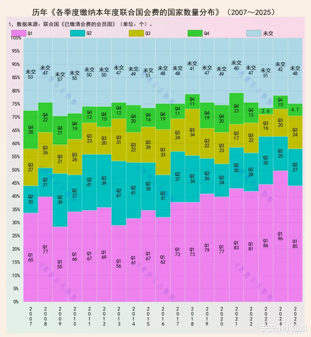 从2007年到2025年的数据显示,联合国成员国的会费缴纳行为发生了明显变化。