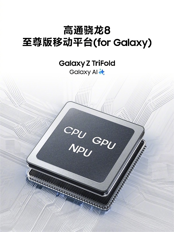 我对手机性能的要求从不妥协,无论是多任务办公还是重度应用运行,都需要强劲性能作为支撑。三星Galaxy Z TriFold搭载专为Galaxy定制的骁龙®8至尊版移动平台(for Galaxy),增强的NPU、CPU 与GPU性能,不仅能轻松应对10英寸屏幕上的多任务并行,更能流畅运行大型3D游戏,以及应对AI绘图、视频剪辑等重度应用。