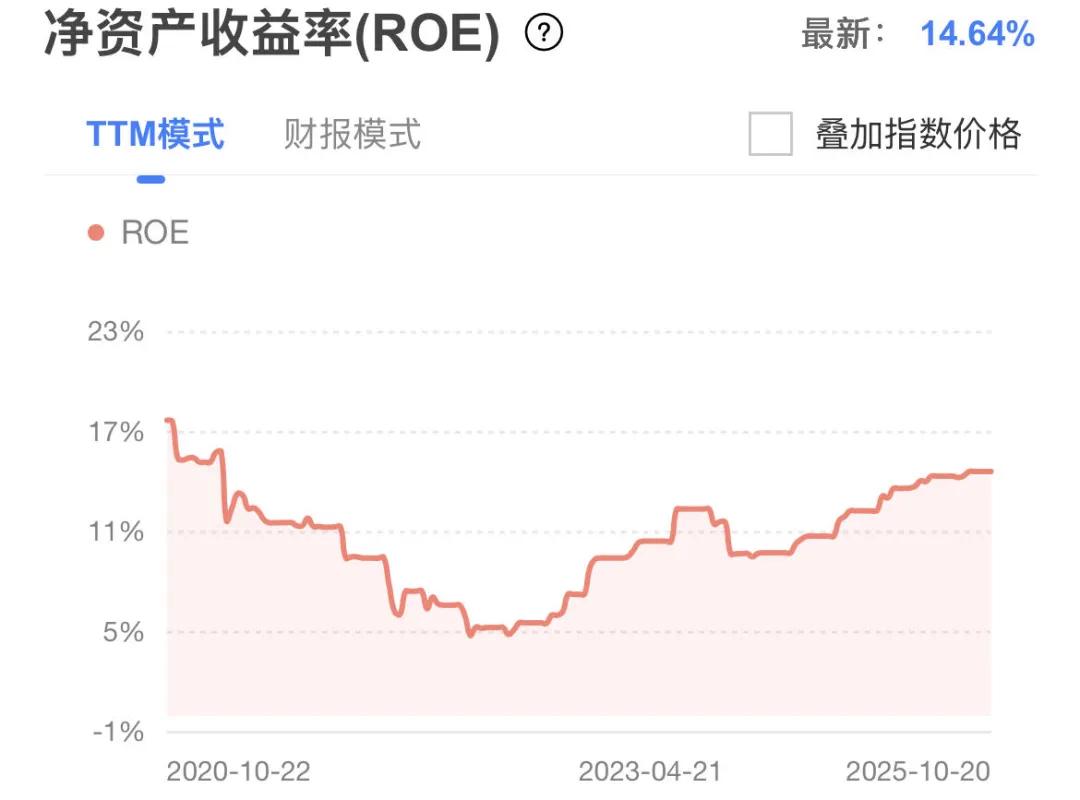 下图是恒生科技的净资产收益率ROE走势,自2022年见底之后,ROE一直在稳步回升,最新ROE为14.64%。