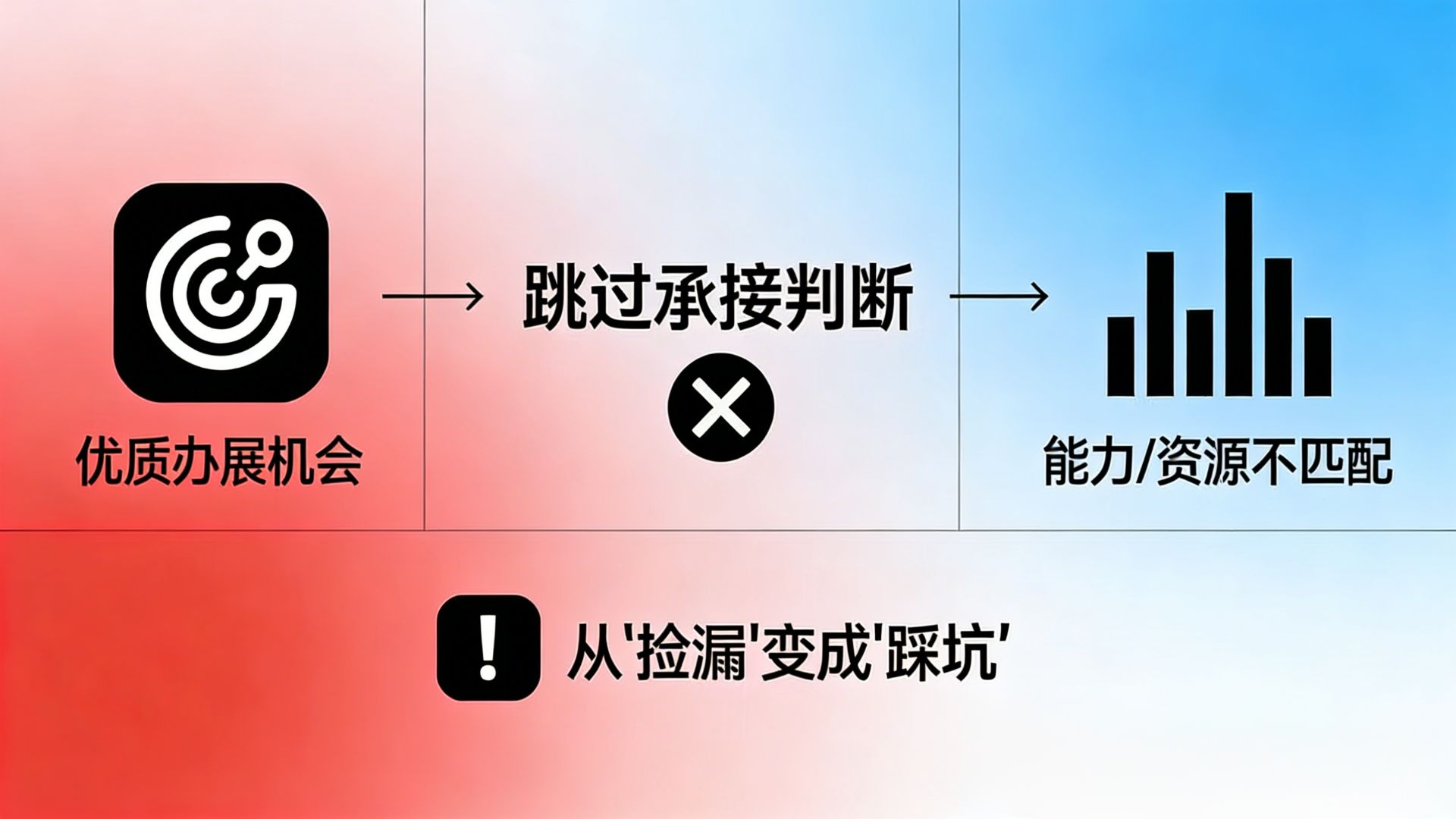 在新的机会面前,应该先过闸门定资格,再做适配看契合度,最后才能得出“可承接/暂不承接/不承接”的明确结论。