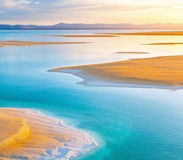 在青海省海西蒙古族藏族自治州格尔木市的柴达木盆地腹地,东台吉乃尔湖以其独特的高浓度盐结晶与矿物质含量,呈现出一片清透的蓝绿色调。这片面积约120平方公里的咸水湖,湖床由白色盐晶构成,水体因光线折射与矿物成分形成高饱和度色彩,与周边灰黄色的雅丹地貌形成鲜明对比。