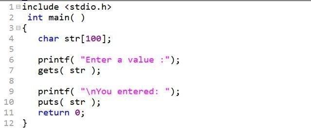 char *gets(char *s)函数从stdin读取一行到s所指向的缓冲区,直到一个终止符或 EOF。int puts(const char *s)函数把字符串 s 和一个尾随的换行符写入到stdout。