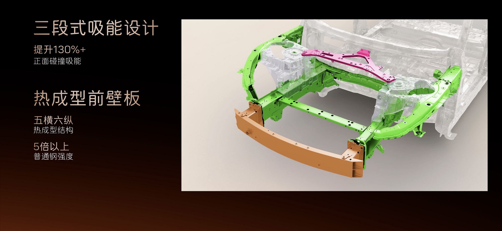 电池安全方面,电芯采用宁德时代AI 加强的第八代智能产线,累计通过150+项专项安全和性能试验,电池0起火0爆炸,达到了极高安全标准。此外,门槛梁采用全贯穿式六宫格铝型材和热成型钢三层外中内板组合设计,形成“三明治”式防护结构,外加热成型双拼座椅后横梁结构,组成三重防护结构,在遭遇冲击时高效保护电池。