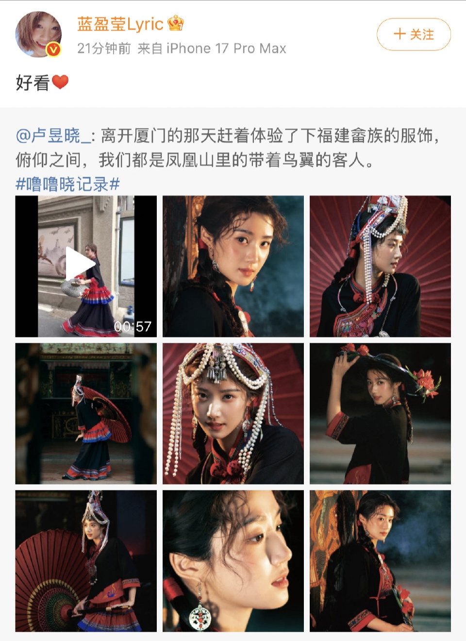 事情是这样的,卢昱晓前段时间在福建厦门那边,临走之前呢,体验了一下当地的畲族服饰。她把拍好的写真照片发到了网上。照片里头,她穿的是那种传统的畲族服装,主色调是黑红撞色,上面有很精致的刺绣,头上还戴着层层叠叠的银饰凤凰冠,就是那种很有民族特色的“凤凰装”。这衣服穿在身上,显得人既有韵味又挺特别的。
