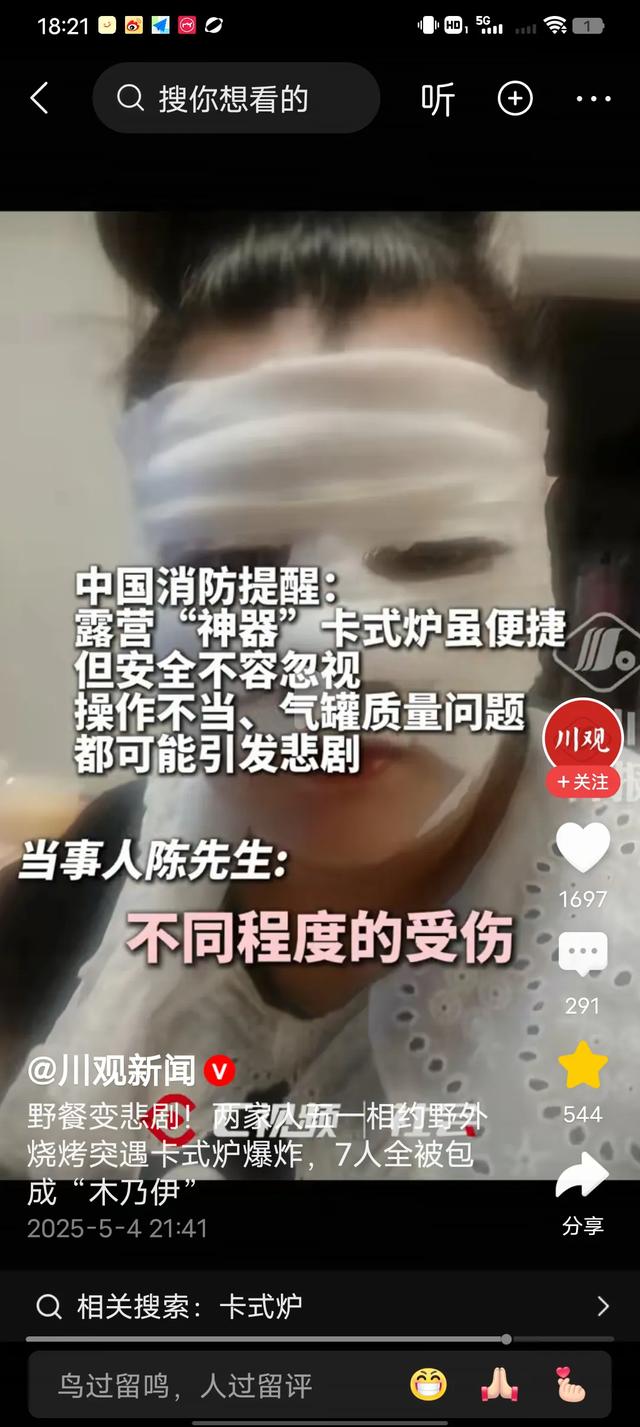 五一假期,有一名北京男子带着家人和邻居一起到外面进行野外烧烤。结果烤肉还没有吃上,却突然遇到卡式炉爆炸,7人全被炸伤,最后包成了“木乃伊。”