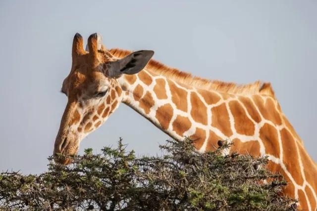 作为反刍类鹿科动物,长颈鹿主要以各种树叶为食,一天可进食100多斤,食量非常惊人,耐渴能力也很强,最多可以连续30天不喝水。