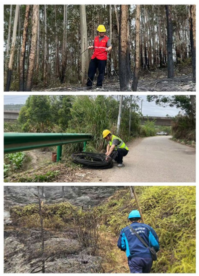 山火发生后,贺州移动第一时间启动应急预案,组建抢修团队奔赴一线。据统计,14天内累计出动抢修人员64人次、车辆16车次,抢修光缆故障历时116.78小时,抢修光缆耗材达4.1公里。针对因山火导致的3个基站烧毁和566.65小时基站感知退服时长,团队通过“先抢通、后修复”原则,优先恢复核心区域通信,确保群众紧急通信需求。
