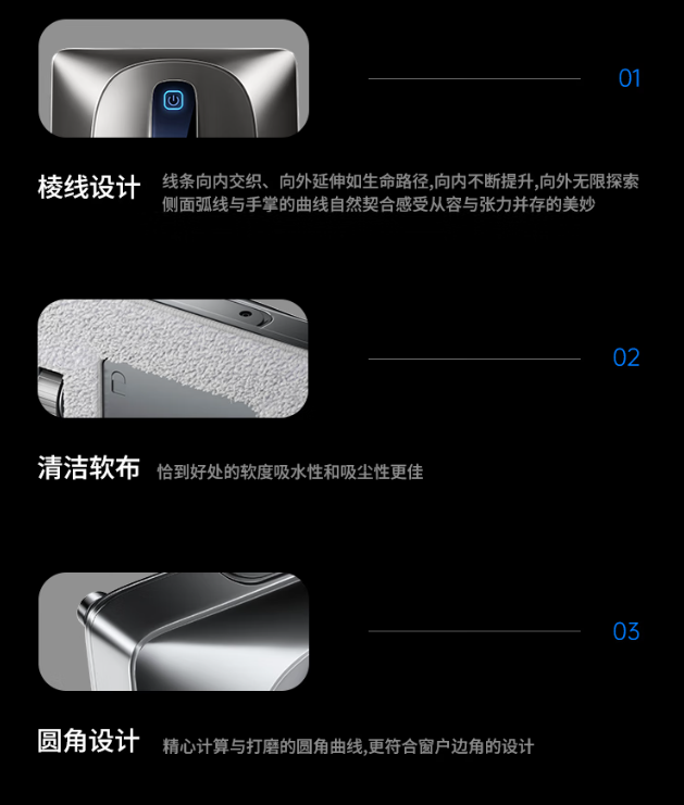 相比很多百元级擦窗机只能“勉强擦干净”,希亦W1可以说是清洁领域的硬核代表,坚持「稳·净·护·智」四大核心理念,每一处细节都经过多年打磨。其核心亮点在于,让玻璃从顽固污渍到表面养护都能一次搞定。