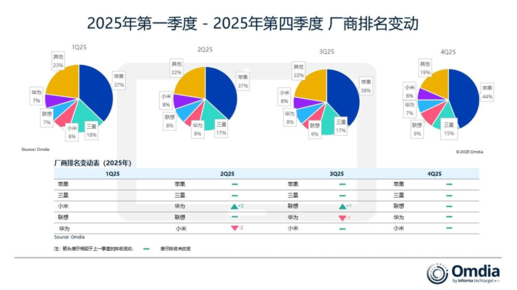 根据Omdia的调研数据,2025年全球平板市场出货量同比增长9.8%,达到1.62亿台。苹果与三星在2025年的4个季度中一直保持着前二的排名,合计占据了约55%的市场份额。