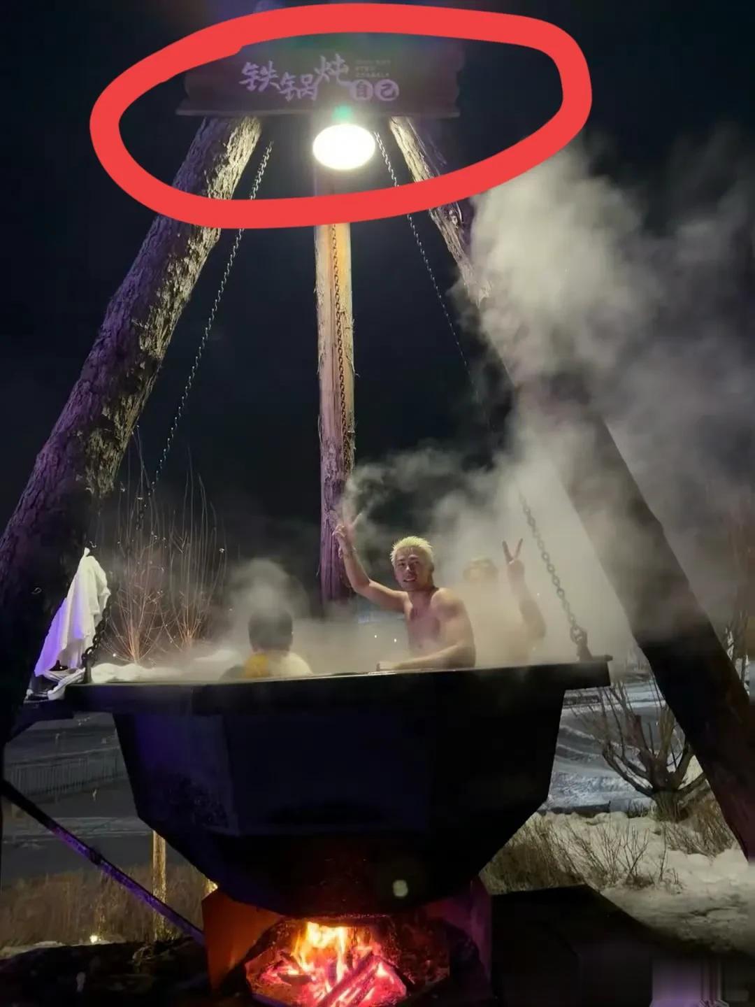 一口大铁锅,下面烧着火,人在铁锅里泡澡。天寒地冻的,他头上感觉都在冒烟,这种别样的体验,大概也就咱们北方能体验到!