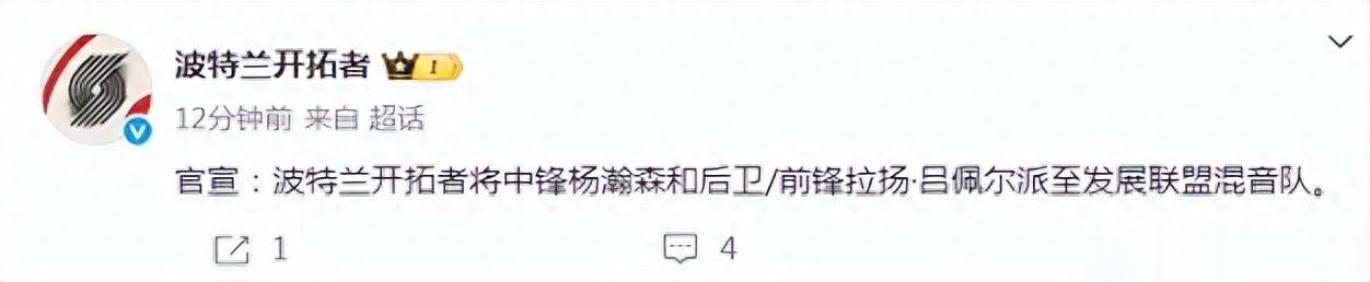 开拓者官方表示,将杨瀚森与吕佩尔下放到发展联盟混音队。杨瀚森此前在发展联盟已出战3场,最近一场贡献20分、7篮板、7助攻、2抢断、2盖帽及2记三分。本次下放后,他有望在12月16日和17日连续两天随发展联盟球队撕裂之城混音主场对阵斯托克顿国王,进行背靠背比赛。