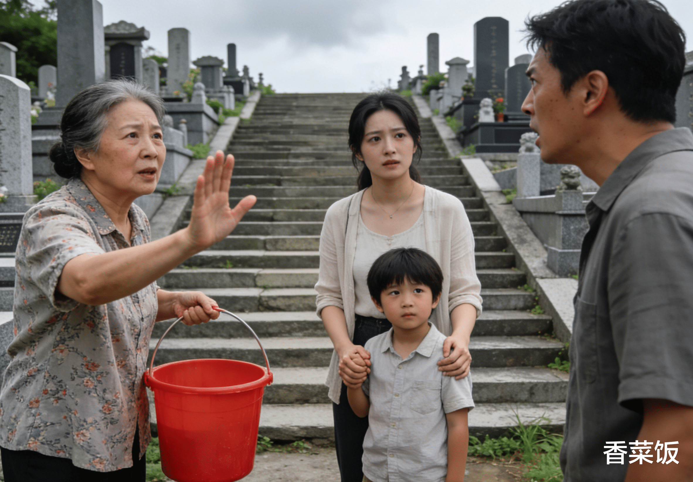 婆婆第一个下车,手里提着那个鼓囊囊的红色塑料桶,里面是香烛、供果,还有厚厚几沓印着“天地银行”的纸钱。