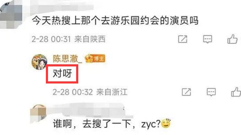 陈思澈这是在控诉自己的男友呢,而且她这段文字中的指向性很明显,“游乐园吃饭搂腰又挽手”,就差把郑业成的名字报出来了,评论区也有人在猜测她说的是不是郑业成,陈思澈回答“对呀”。