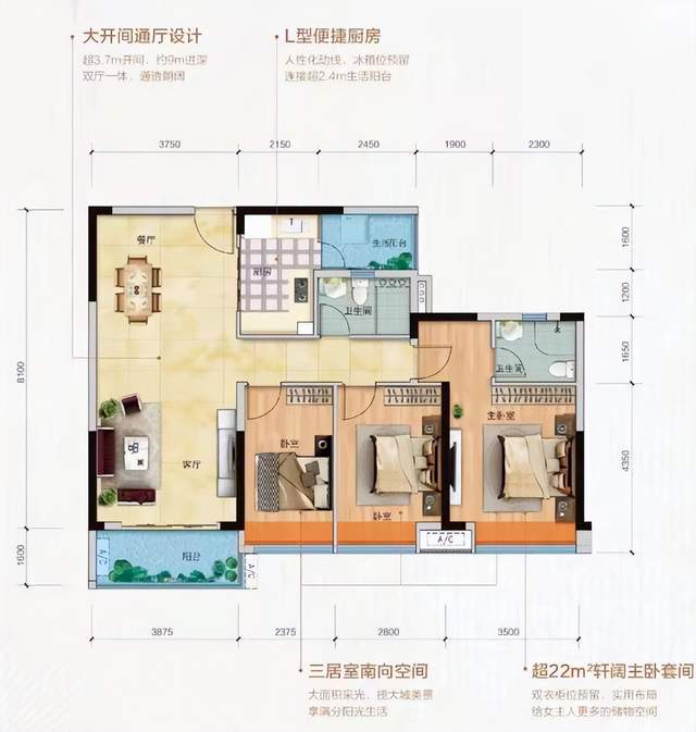 三居室南向空间,通透采光,大面积客厅与主卧,生活动静分区。L型厨房便于操作与收纳,主卧面积达22㎡,独立卫浴、双衣柜布局,长久居住也十分舒适。客厅、餐厅与阳台一体化空间,适合现代家庭的生活节奏。每个卧室分区合理,最大化满足父母、孩子等家庭成员需求。
