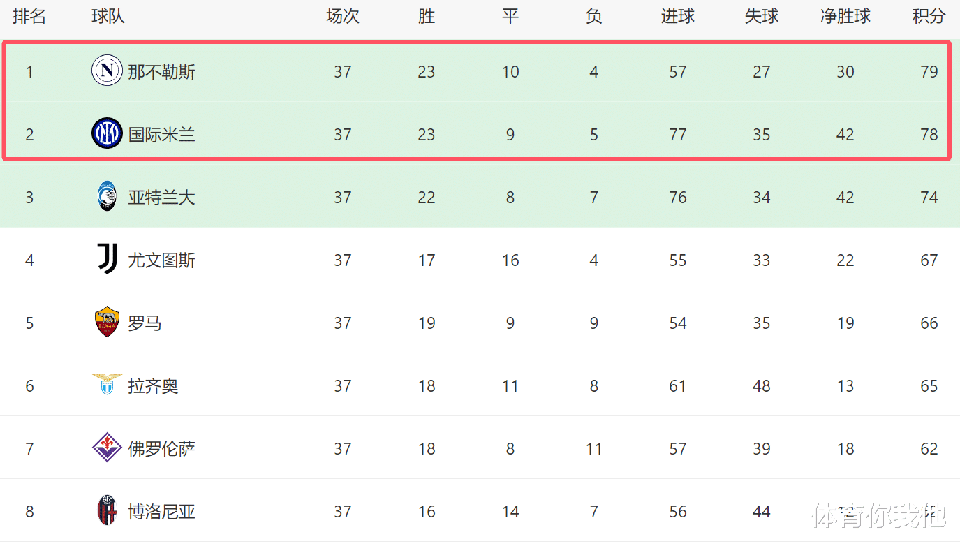 前37轮比赛踢完,那不勒斯领先国米1分,这也意味着,他们占据争冠绝对主动权。接下来,只要在主场战胜卡利亚里,那不勒斯就肯定夺冠,他们无需看国米的脸色。