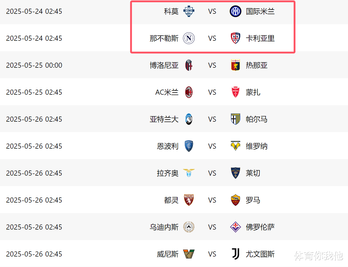 北京时间5月24日凌晨2点45分,本赛季意甲争冠决战,那不勒斯和国米将分别对阵卡利亚里和科莫,这2场比赛的结果,将决定本赛季意甲冠军的归属。严格来讲,是那不勒斯的比赛结果,将决定国米的命运。