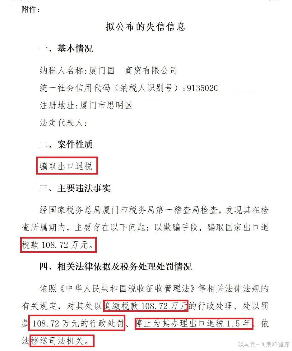 经国家税务总局厦门市税务局第一稽查局检查,发现其在检查所属期内,主要存在以下问题:以欺骗手段,骗取国家出口退税款108.72万元。