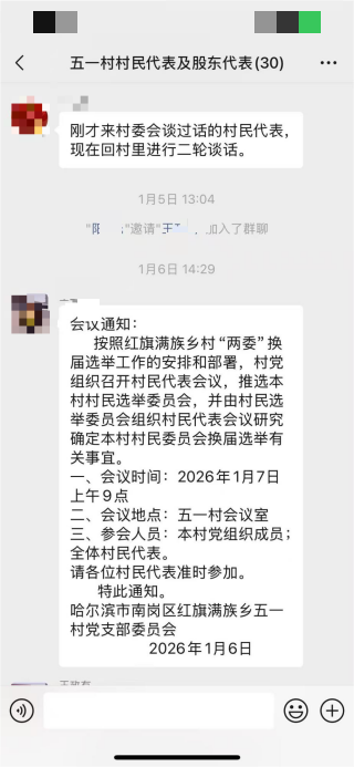 2026年1月25日,该村召开股东代表大会,仅17人参会却推选7名选举委员会成员,不符合“参会人数不少于应到会三分之二”的规定,应属无效;1月9日发布的换届选举2号公告未通过村民代表会议审议,系王某有“一言堂”擅自发布。目前,村民已掌握多项关键证据,包括王某有贿赂村民代表于某文的录音(已被红旗乡纪检部门核实)、社交软件截图、选举名单等。但村民通过12388平台举报后,红旗乡相关部门仅电话沟通便无下文,合理诉求未获回应。
