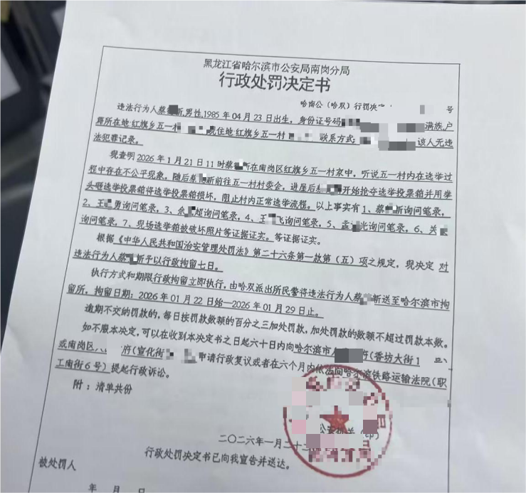 村民蔡某新得知选举违规情况后前往村委会质疑选举不公,因情绪激动损坏相关物品、阻碍流程,被哈尔滨市执法部门南岗分单位处以行政拘留七日。处罚决定书显示,蔡某新无违法犯罪记录,其违法行为有多项证据证实,拘留期限为2026年1月22日至29日,可申请行政复议或提起行政诉讼。他的遭遇,再加上金某香的经历,让不少村民因担心被处罚、被威胁而不敢质疑选举不公。